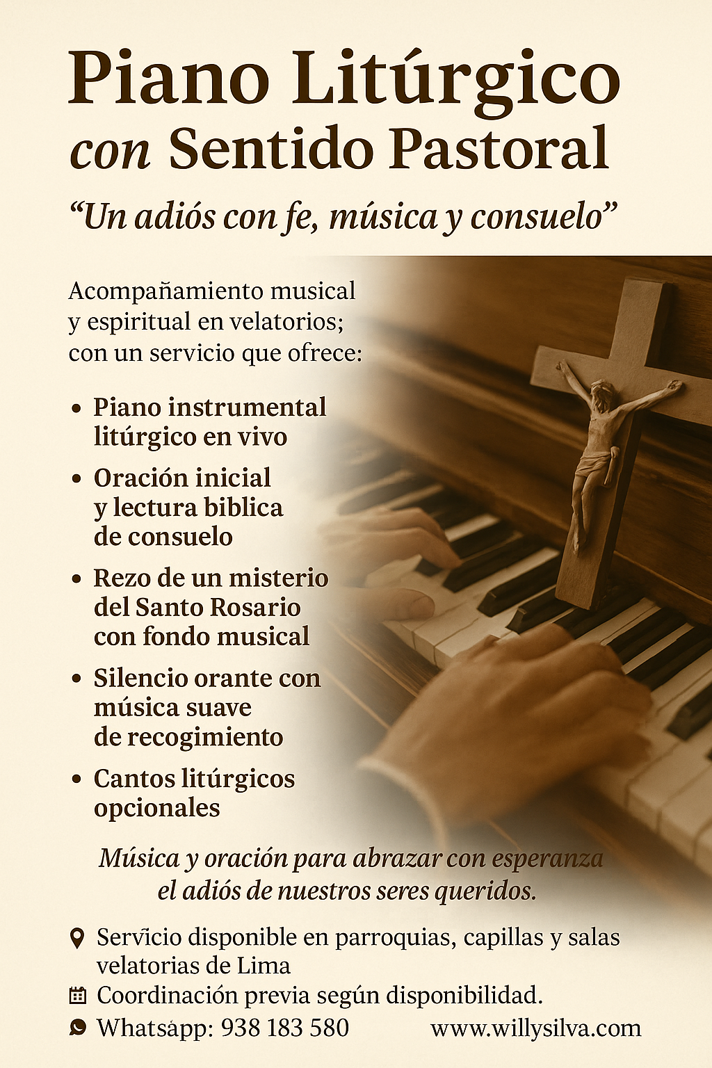 Soy Willy Silva, músico pianista, compositor, y actual servidor litúrgico en mis comunidades parroquiales: Comunidad franciscana de San Antonio de Padua (Jesús María), Nuestra Señora del Consuelo (Stgo. de Surco Monterrico) y Nuestra Señora de Guadalupe (Lurín, Sur de Lima Perú). Desde muy joven siendo acólito descubrí el poder espiritual de la música, y con el tiempo comprendí que el piano no solo es un instrumento artístico, sino también un canal para alabar, servir y acompañar la fe de otros.